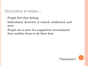We typically talk about this in terms of diversity and inclusion, diversity of background, diversity of opinions, and everyone feeling that they’re included. However, I’m starting to prefer the language of “belonging.” This institution belongs to all of us. If you’re here, you belong here. This is YOUR institution. This is subtly different from inclusion, which still implies that something from the outside is in some sense inserted, or added, to something that already exists.