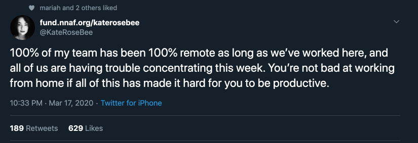 A few people have remarked with similar sentiments along the lines of “this isn’t so much about changing where we work, so much as trying to maintain during a crisis.” I hope you’re being kind and patient with yourself, in addition to the folks around you. And parents…I really feel for you.