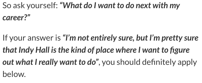 Of probably dozens of job descriptions and applications, Indy Hall’s were immediately unique. Besides describing the ideal candidate, the job description and requirements were vague and intriguing. But there was one neon sign of a sentence which really got me curious: